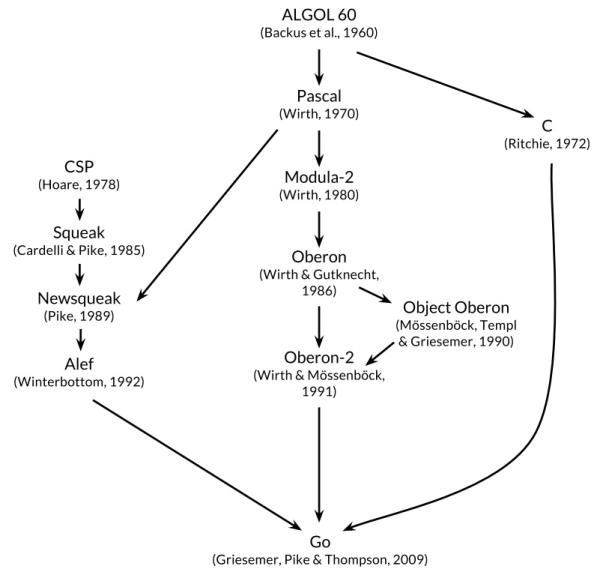 得益于 Go 语言的三位创始人,Go 语言继承了 C 语言的诸多特性,而为了适应 Web 开发又具有一些动态语言特性,并为多核处理器时代内建并发支持。 最终目标是成为网络和多核时代的 C 语言。下图描述了 Go 语言基因族谱。