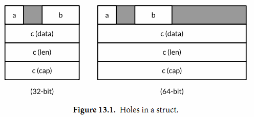 图 13.1 显示了一个结构体变量 x 以及其在32位和64位机器上的典型的内存. 灰色区域是空洞.